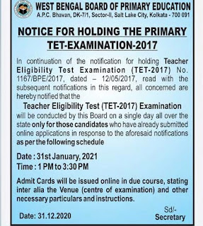 মুখ্যমন্ত্রী মমতা বন্দ্যোপাধ্যায় জানিয়েছেন যে 31 শে জানুয়ারি হবে প্রাথমিক টেট এর নির্দিষ্ট সময়ে বিজ্ঞপ্তি প্রকাশিত করবে প্রাথমিক শিক্ষা সংসদ বৃহস্পতিবার প্রকাশিত হলো সেই বিজ্ঞপ্তি।