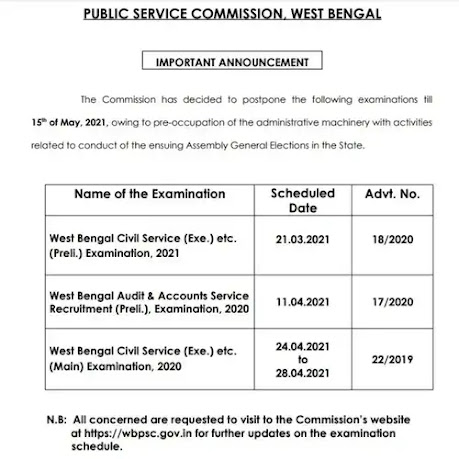 21 শে মার্চ সিভিল সার্ভিস এর প্রিলিমিনারি পরীক্ষা হওয়ার কথা ছিল 11 ই এপ্রিল হওয়ার কথা ছিল পশ্চিমবঙ্গ অডিট অ্যান্ড অ্যাকাউন্টস সার্ভিসের প্রিলিমিনারি পরীক্ষা আরে সিভিল সার্ভিস পরীক্ষা হওয়ার কথা ছিল 24 এপ্রিল থেকে 28 এপ্রিল পর্যন্ত সেই সময় ভোটের কারণে স্থগিত রাখা হয়েছে সিভিল সার্ভিস পরীক্ষা।
